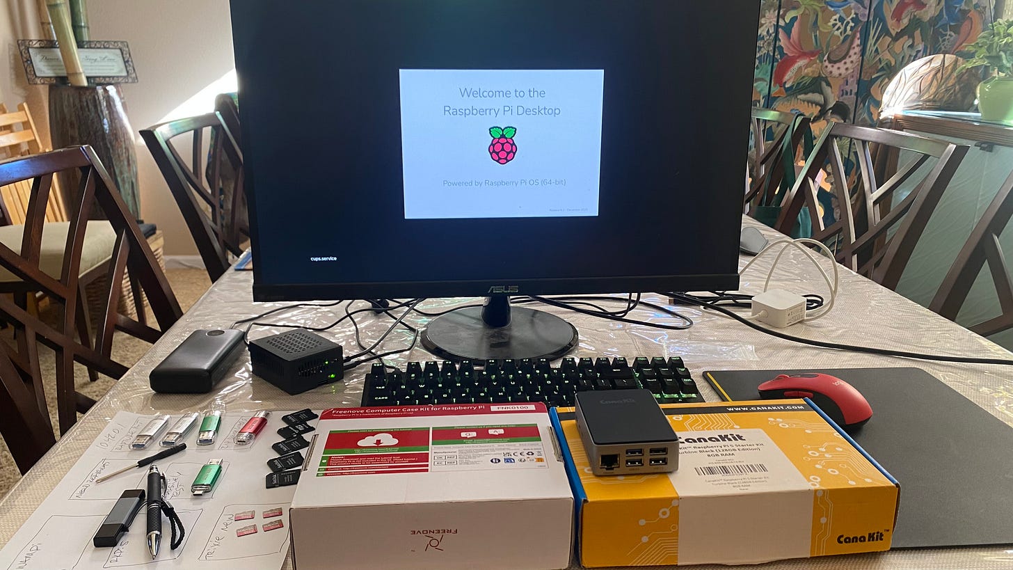 Kevin has done a great job testing the Pi and has suggested a usability enhancement. He noticed an opportunity for laptops or PCs using Windows 10/11 to have a better experience seeing the static website. So, what you see above is my preparatory steps for another round of development and testing. On the left foreground you can see all the USB drives (silver, green, red) that have Rapture Kit 3.1 on it. To the right are the adapter cards for the microSD card to be inserted into a PC or Mac having a SD slot. If you look carefully, the four red/hold microSD cards have a fresh image of the Trixie 64-bit Pi5 operating system with full desktop ready to support the configuration testing steps that must be done. The white box with red stickers is the new (as yet unopened) Pi case featuring the 5” touch screen with 2 speakers and a headphone jack. I’ll be working on this soon. And the yellow “starter kit” CanaKit is what I recommend to people wanting an evangelical solution like this.