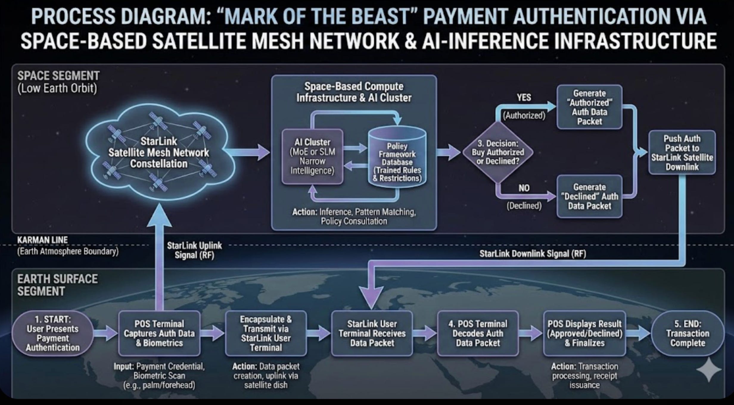 The centerpiece of our episode covered the article I released last Tuesday night entitled “Are Space-Based Data Centers in our Future?” (here). One of the things I had prepared was a theoretical process diagram for how I see it working. Let me draw your attention to the “Space Segment” and the “Earth Surface Segment” (see below) and how they interact for payment authorization when the Mark of the Beast becomes active. We will not see this system, but it is being built right now.