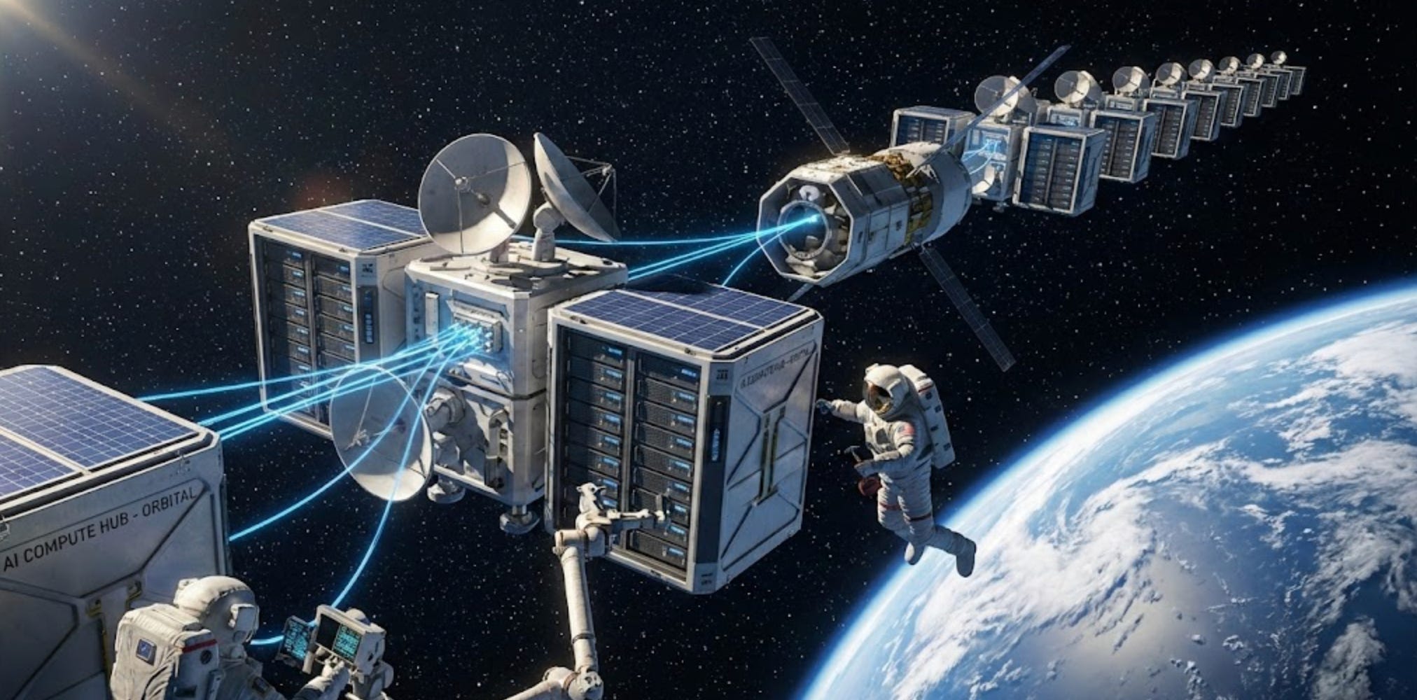 If I were to visualize what this might look like in space, it might look like this. This was rendered by Nano Banana Pro from Google. My prompt wasn’t very defined. The intent is to show you what AI clusters might look like in space. If each segment or unit was brought up by a Falcon Heavy (here) I don’t think it would take longer than a few months to get a working system together. My post goes into a lot more detail about why they are thinking about putting AI in space.