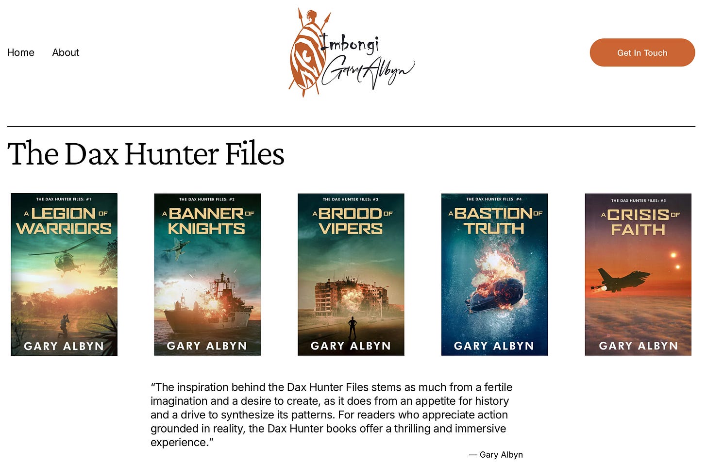 Please check it out! It presents all three of his series. It begins with “The Dax Hunter Series” (number 1 through 5). The “Africa’s Big Five Series” (2 books) which are incredible poems with jaw dropping artwork from renown artists. The last is a book on “Building a Bug Out Bag”. Speaking of the Bug Out Bag book, for people that Subscribe to Gary’s newsletter (look for the signup in the bottom right of the home page) he will email you a free PDF copy of the book as a thank you! Note: this is not automated yet. Gary will manually send it.