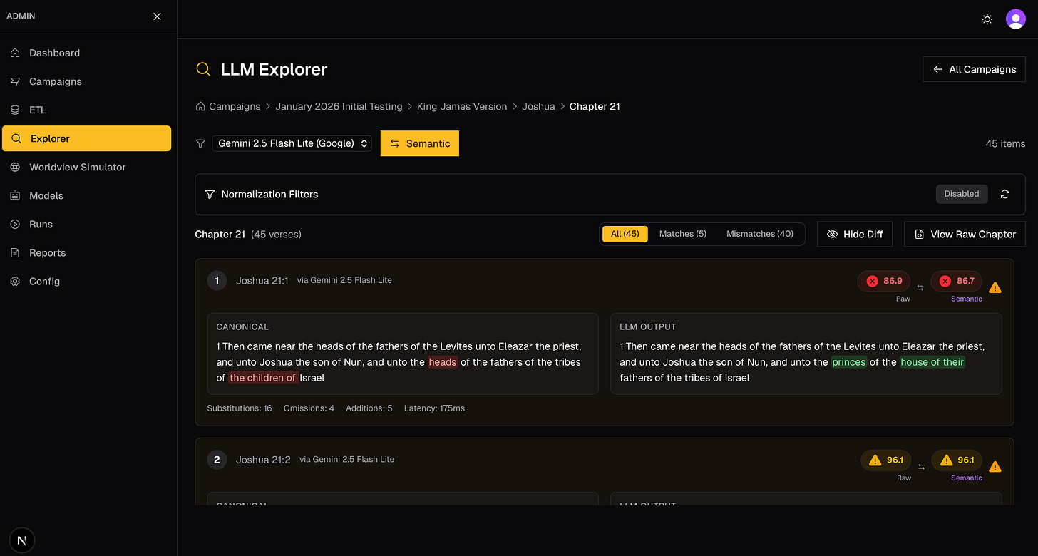 Exact Mode—which takes the principle that not one Jot or Tittle (here) difference is allowed. Any—and I do mean any—difference between the canonical single source of truth and what an AI gives the user in a chat session is marked as a mismatch.